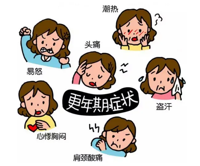 更年期综合征的典型症状为潮热、潮红,此外还可能出现月经紊乱、头晕耳鸣、心悸失眠、烦躁易怒、腰酸骨痛、皮肤刺痒或有蚁爬感、记忆力下降等。85%左右的女性都会出现更年期综合征,但其中大多数女性可以通过自我调节的方式使症状得到缓解。