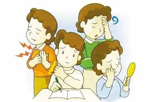 严重时有恐惧情绪,对外界刺激易出现惊恐反应,常伴有睡眠障碍和植物神经紊乱现象,如入睡困难、做恶梦、易惊醒、面色苍白或潮红、易出汗、四肢发麻、肌肉跳动、眩晕、心悸、胸部有紧压感或窒息感、食欲不振、口干、腹部发胀并有灼热感、便秘。